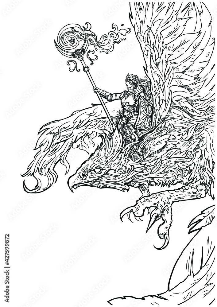 Coloring Book For Adults A Female Magician In Plate Armor With A Magic Staff Casts A Spell And Flies Astride A Beautiful Phoenix With Sharp Claws And Feathers 2d Illustration Stock Vector